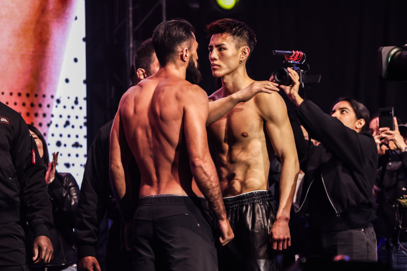 前日計量。海人(右)とグレゴリアン(左)が睨み合い (C) ONE Championship