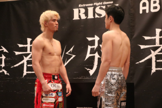 3月29日(土)東京・両国国技館で開催される『ABEMA presents RISE ELDORADO 2025』の前日計量&記者会見が、28日(金)都内にて行われ、[スーパーライト級(-65kg)3分3R延長1R]で対戦する、原口健飛(FASCINATE FIGHT TEAM/ISKA世界ライトウェルター級王者、第6代RISEライト級王者)は64.9㎏、対するイ・ソンヒョン(韓国/RAON/同級1位、第4代RISEミドル級王者、第2代RISEライト級王者)は64.95㎏でそれぞれ計量パスした。