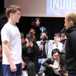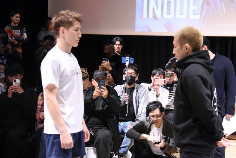 今月7日の公開練習で対面した元谷(右)と井上(左)