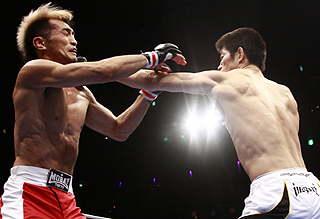 日沖(右)が強烈なパンチで攻める(10年5月)