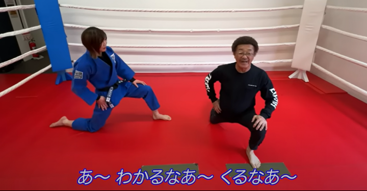 角田(左)が具志堅(右)に太腿のストレッチを伝授(YouTube角田夏実の部屋より)