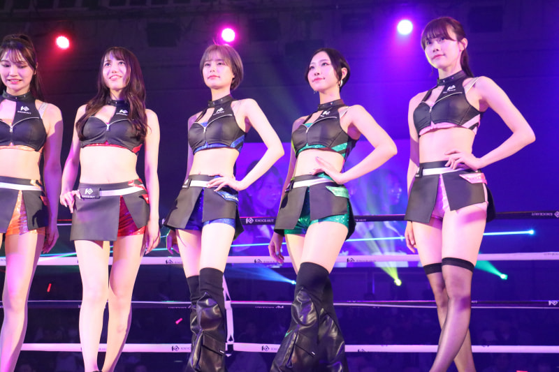 ラウンドガール衣装でポーズをとる有栖(右から2番目)