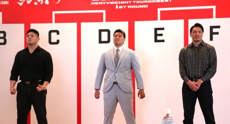 RIZINヘビー級トーナメントの抽選会に出席した(左から)スダリオ、上田、シビサイ