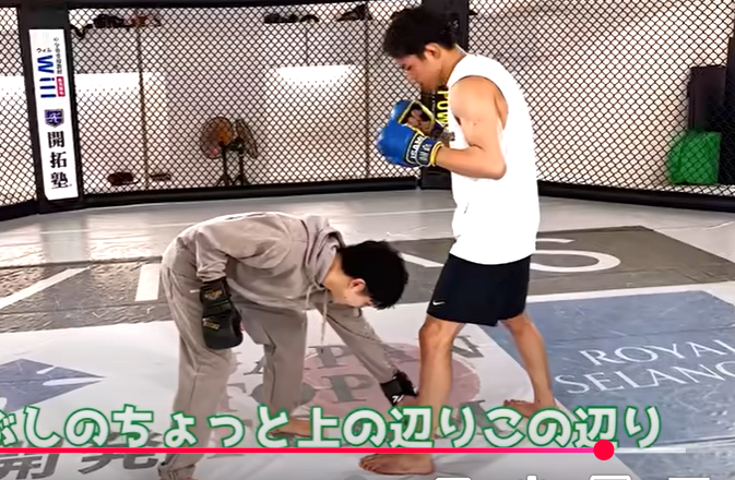 相手がパンチしてきたら、前足のくるぶしの辺りを蹴り上げるという(『KAI Channel/朝倉海』より)