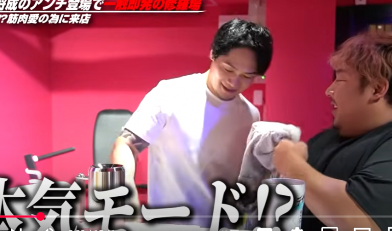 飯田は上着を脱いでノッコンの筋肉企画に挑戦(『ノッコン寺田』YouTubeチャンネル)