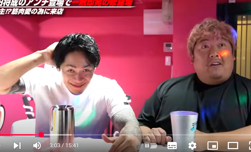 BDで活躍中の元ボクサーの飯田将成(左)は、ノッコン寺田のバーでパワーを見せつけた(『ノッコン寺田』YouTubeチャンネル)