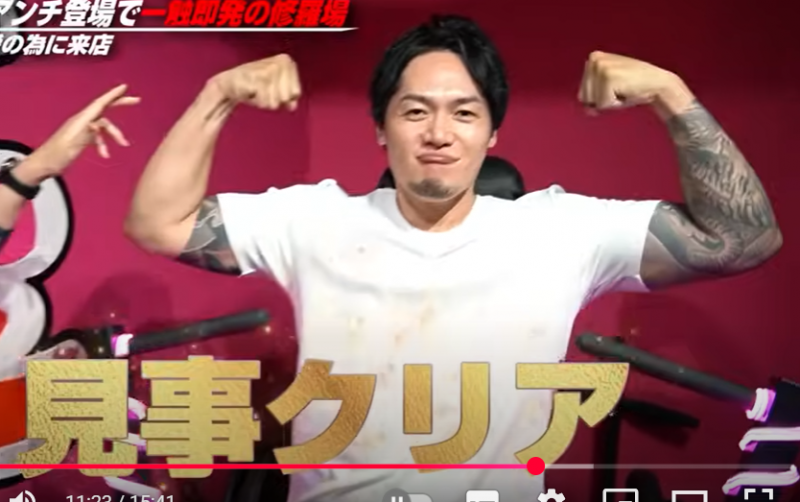 すべて制覇してマッスルポーズを決める飯田(『ノッコン寺田』YouTubeチャンネル)