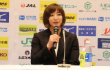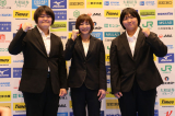 - 会見での角田夏実(中央)の全身写真、78kg超級の新井万央(左)、井上朋香(右)と