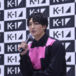 大久保は会見で黒とピンクの奇抜な衣装で登場