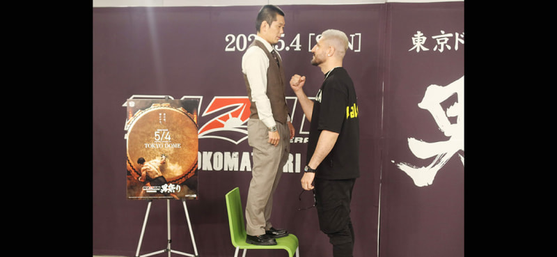 身長193cmのカリミアン(右)を、皇治が椅子に乗って見下ろす