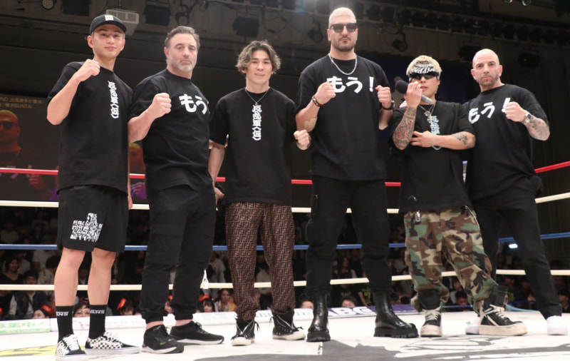K-1反乱軍リベリオンのメンバー。左から松山、ニコラス、レオナ、カリミアン、永坂。右端はニコラスジムの関係者