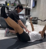 - バランスボールを脚ではさみ、姿勢を保ちながらのトレーニングが続く(@michopa1030)