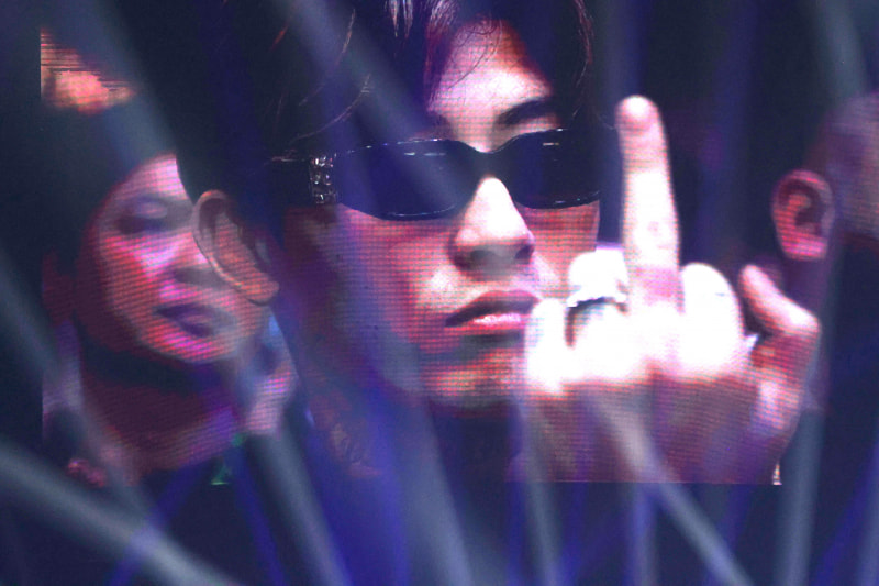 平本は朝倉の試合後、中指を立てた(会場の大型ビジョンより)
