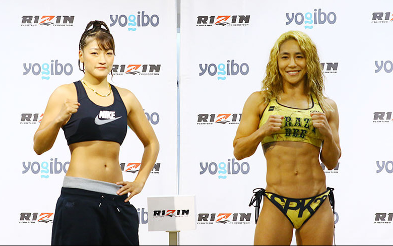 山本美憂(右)の”バキバキ”ビキニ計量(21年11月)