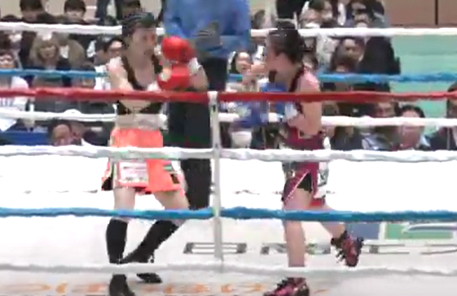 吉田(右)の右が入り、守随が劣勢に(『BOXING REAL』)