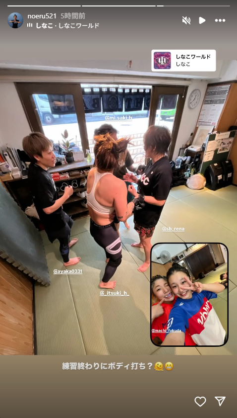 右下に映っているのがNOELと万智。右の黒いTシャツがRENA。左は奥から浜崎朱加、平田樹