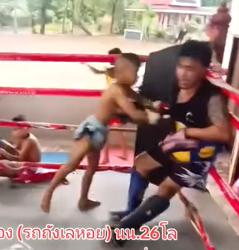 前蹴りで大人を転倒させるちびっこムエタイ戦士体重26kgのちびっこムエタイ戦士(@muaythaiiyarin)