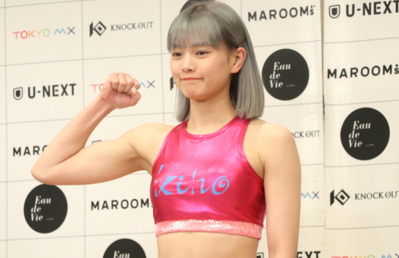 Kihoはピンク衣装で鍛えた腕と腹筋を見せた