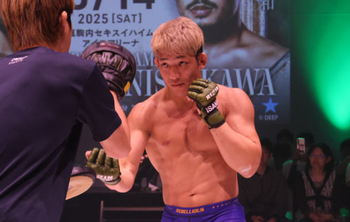 ムキムキの腕でパンチを繰り出す堀江