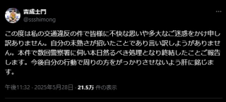 「この度は私の交通違反の件で皆様に不快な思いや多大なご迷惑をかけ申し訳ありません。自分の未熟さが招いたことであり言い訳しようがありません。本件で数回警察署に伺い本日然るべき処理となり終結したことご報告します。今後自分の行動で周りの方をがっかりさせないよう肝に銘じます。申し訳ございませんでした」