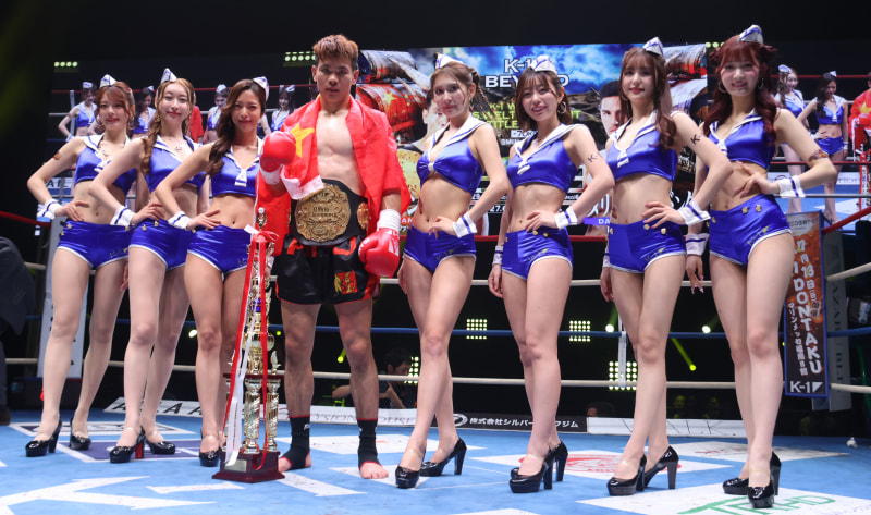 他のラウンドガールよりも大胆な波北(右から4番目)の胸元