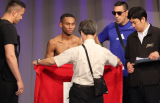 また、第4試合のWBOアジアパシフィック バンタム級王座決定戦(53.52kg)で対戦する坪井智也(帝拳)とバン・タオ・トラン(ベトナム)も無事にパスしたが、第3試合のバンタム級(53.52kg)で増田 陸(帝拳)と対戦するミシェル・バンケス(ベネズエラ)が53.7kgと180gオーバー。再計量でも53.6kgで体重超過となったが、増田陣営が了承したため、試合は実施される。