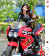 - バイクに乗り、サックスを持つななえタン(@natsuki_nanae)