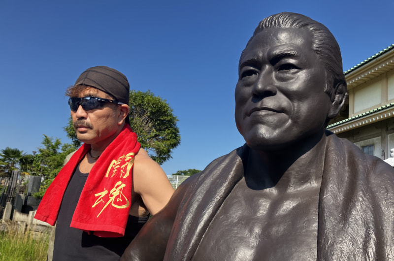 超人イリエマン(左)がアントニオ猪木の墓参りに訪れた