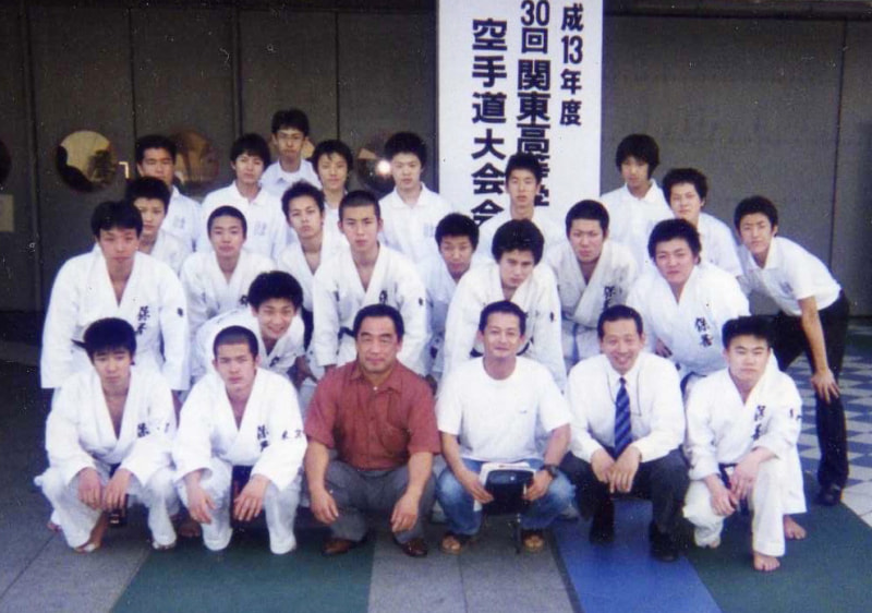 創部から5年、2001年の関東大会では初戦敗退だった。右から2人目が奈佐監督、中央左は東原師範、右は当時指導に来てくれていた師範の後輩の横溝正典先生(本人提供)