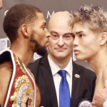 両者計量パス 王者ノーマン(左)はムキムキ だ