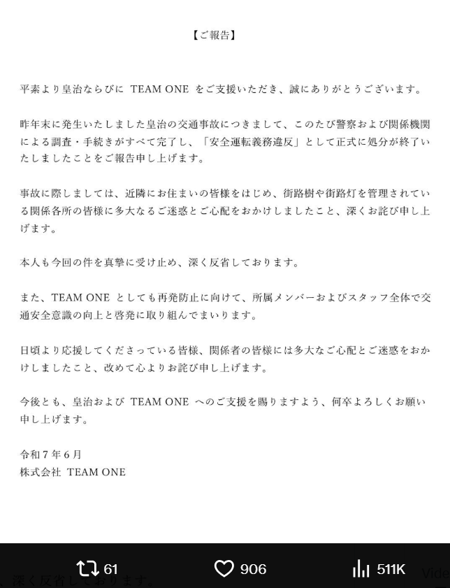 皇治が所属するTEAM ONEからの事故報告書(@1_kouzi)