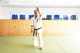 - 選手時代、総本部道場にて。この低い構えで長い時間、しっかり重心を落とし静止。どんなときもブレない構えを身につけた