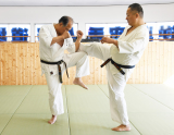- 山崎先生の鉄壁の受け!筆者(吉倉)のミドルキックを受ける