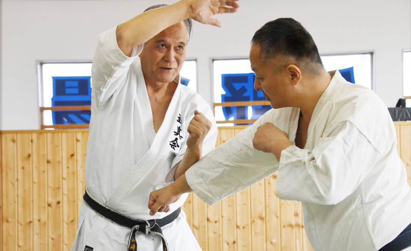 山崎照朝先生が筆者に受けを伝授。撮影は高倉健の専属カメラマンだった山川雅生さんだ