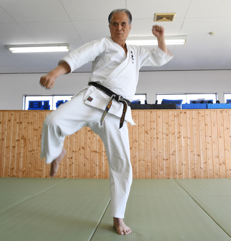 山崎先生のハイキック!72歳で健在(写真:山川雅生)