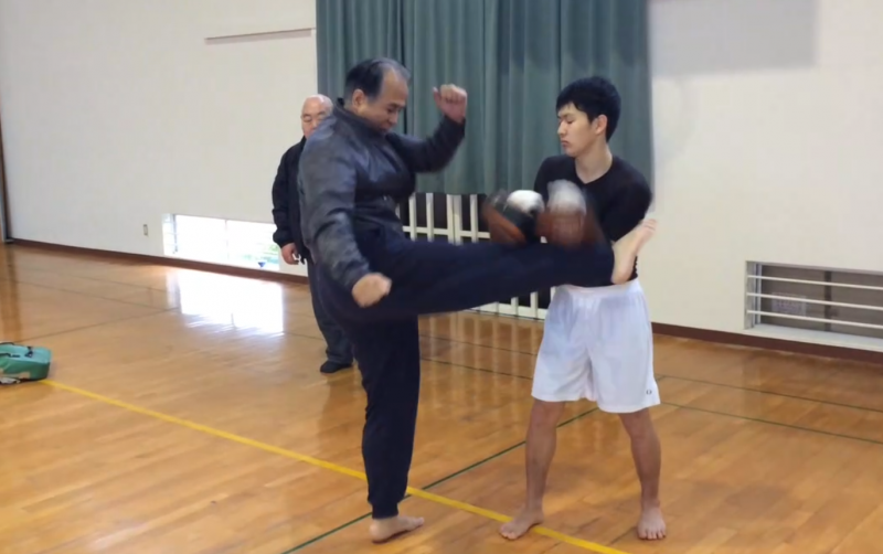 山崎氏70歳を超えてのミドルキック連打(日大キックボクシング部提供)