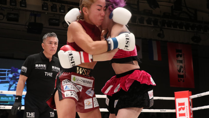 元“最強キャバ嬢”キックボクサーMelty輝(右)の頭がYAYAの顔面に当たって大流血