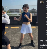 ・【フォト&動画】辻井がミニスカ姿でボディ打ち!割れた腹筋も