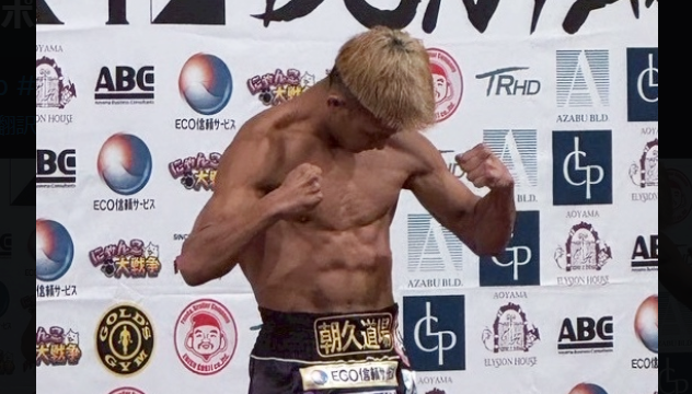 朝久裕貴、計量パスでマッスルポーズ(@K1_ReBootより)