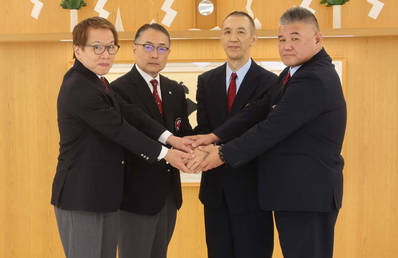 左から極真会館 山田雅稔師範、松井館長、真正会・鈴木代表代行、真正会・内田本部長