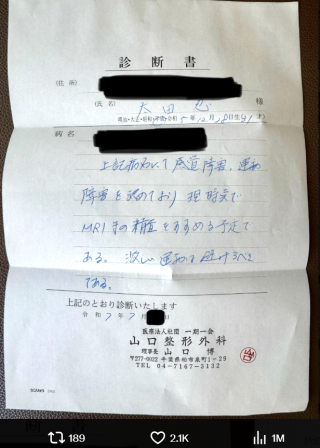 ところが、その日の夜の練習で不調を感じていた太田は、「翌日、すぐに病院で検査したらドクターストップがかかりました」と報告。病名は明らかにされていないが、自身のXにて投稿された診断書には「感覚障害、運動障害」と書かれ、これからMRIの検査も「激しい運動は避けるように」と言い渡されたようだ。