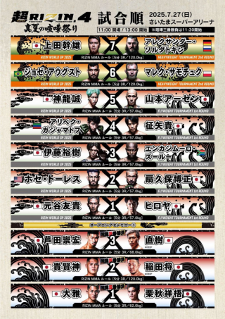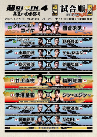 7月27日(日)さいたまスーパーアリーナにて開催される『超RIZIN.4』の全試合順が決定した。