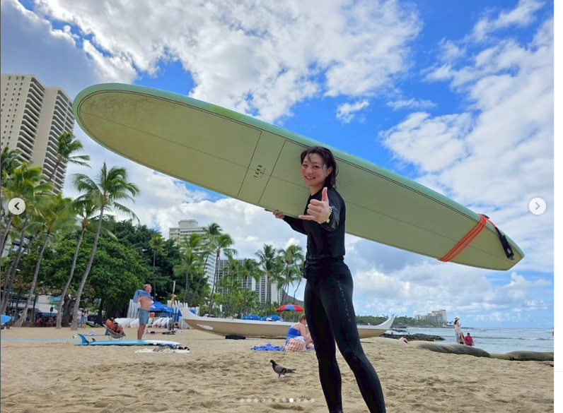 サーフボードを担ぐ角田(角田夏実インスタより)