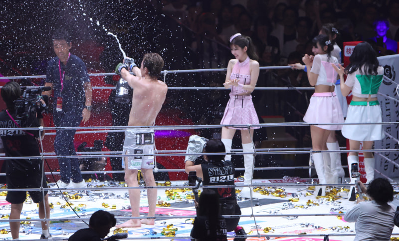 シャンパンで逃げ回るラウンドガールら