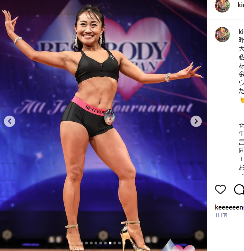 割れた腹筋を披露したベストボディジャパンに入賞したキンタロー。(@kintalo_)