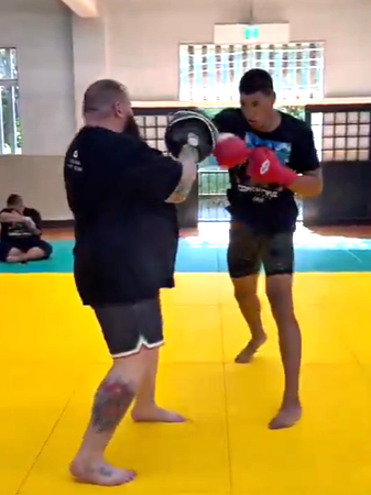 クルーズコーチが持つミットへエドポロキングの右ストレートが炸裂(@pliniocruzmma)
