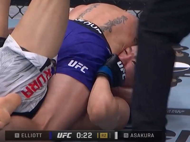 チョークが極まり、苦しむ朝倉海(@ufc)