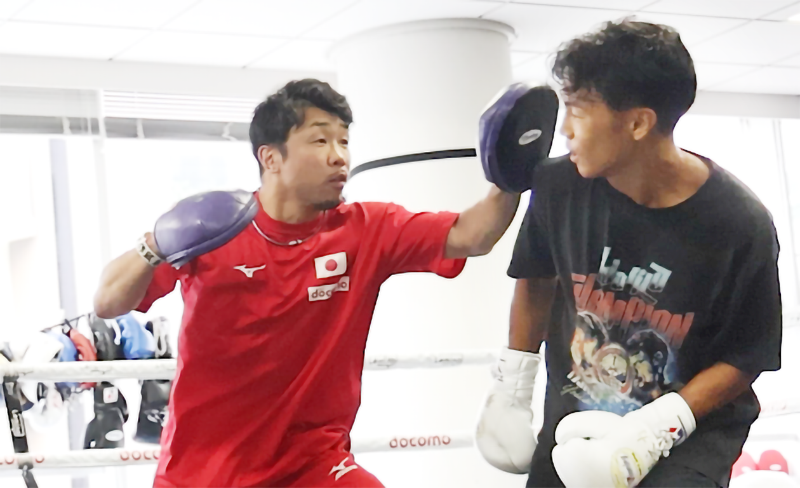 八重樫(左)の得意のジャブで武居(右)が唇を切るアクシデント!