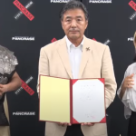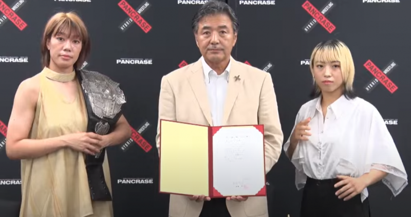 タイトル戦で激突する女王ソルト(左)と挑戦者のKAREN(右)が調印式に出席(PANCRASE公式YouTube)