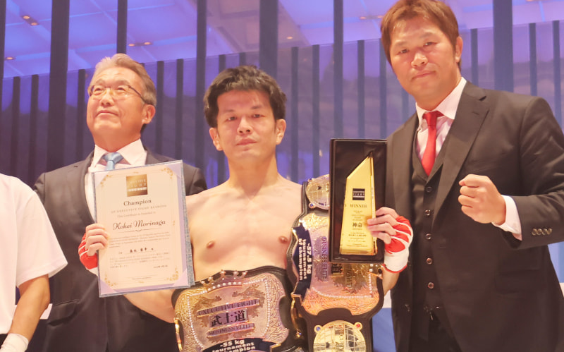 森永康平(中央)が2階級制覇達成!右は主催の小比類巻貴之